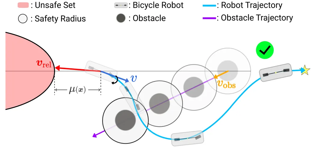 Our paper on dynamic obstacle collision avoidance using CBF has been accepted to ICRA 2026. We propose a Dynamic Parabolic Control Barrier Function (DPCBF) to address the fundamental infeasibility issues inherent in collision cone or velocity obstacle-based methods. By dynamically shaping the safety boundary, this approach significantly improves feasibility in dense environments where traditional methods often fail.