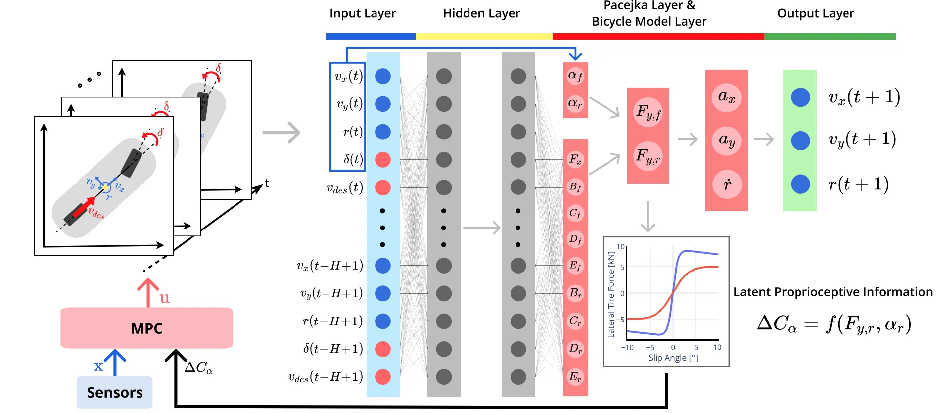 Non-holonomic vehicle motion has been studied extensively using physics-based models. Common approaches when using these models interpret the wheel/ground interactions using a linear tire model and thus may not fully capture the nonlinear and complex dynamics under various environments. On the other hand, neural network models have been widely employed in this domain, demonstrating powerful function approximation capabilities. However, these black-box learning strategies completely abandon the existing knowledge of well-known physics. In this paper, we seamlessly combine deep learning with a fully differentiable physics model to endow the neural network with available prior knowledge. The proposed model shows better generalization performance than the vanilla neural network model by a large margin. We also show that the latent features of our model can accurately represent lateral tire forces without the need for any additional training. Lastly, We develop a risk-aware model predictive controller using proprioceptive information derived from the latent features. We validate our idea in two autonomous driving tasks under unknown friction, outperforming the baseline control framework.