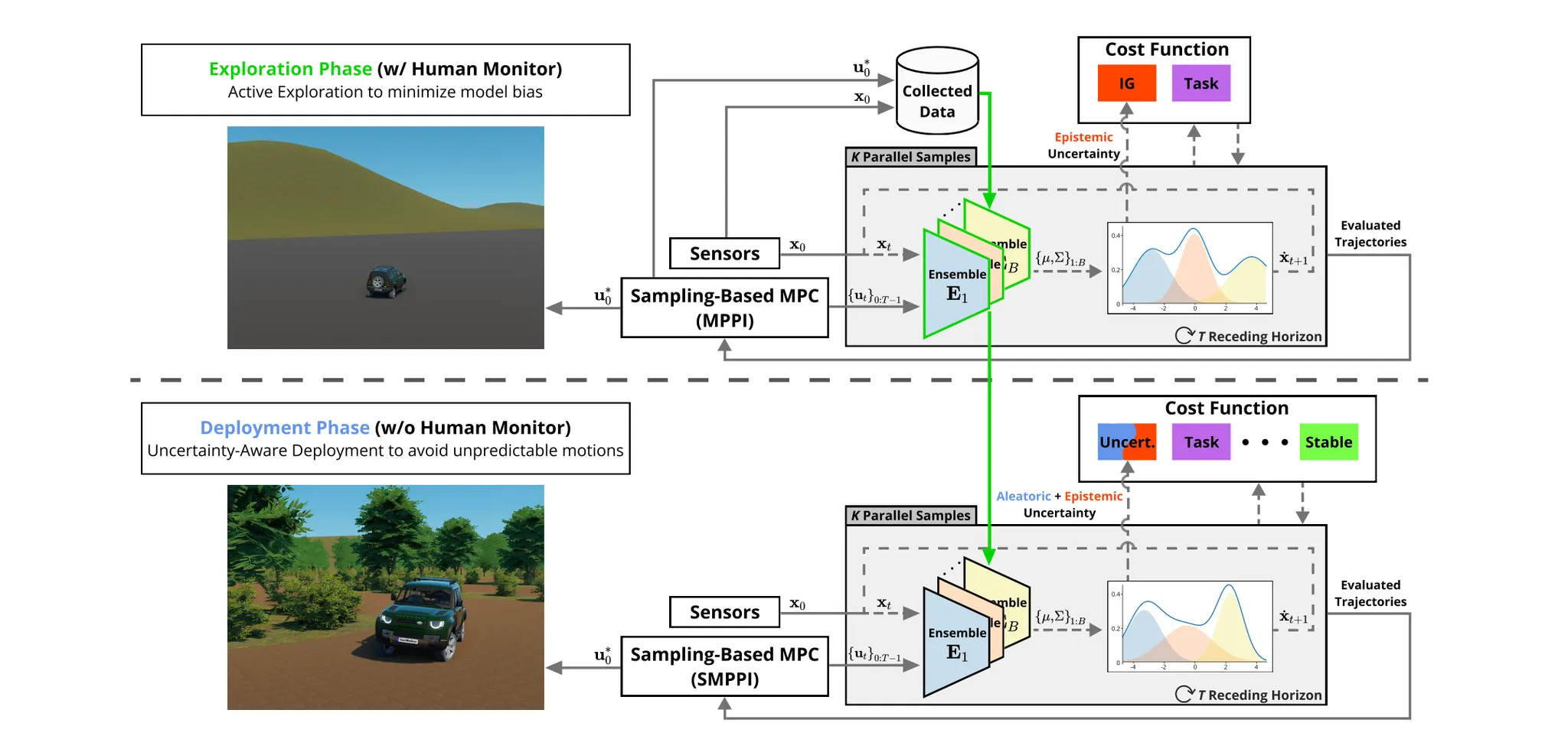 Abstract: In recent years, learning-based control in robotics has gained significant attention due to its capability to address complex tasks in real-world environments. With the advances in machine learning algorithms and computational capabilities, this approach is becoming increasingly important for solving challenging control problems in robotics by learning unknown or partially known robot dynamics. Active exploration, in which a robot directs itself to states that yield the highest information gain, is essential for efficient data collection and minimizing human supervision. Similarly, uncertainty-aware deployment has been a growing concern in robotic control, as uncertain actions informed by the learned model can lead to unstable motions or failure. However, active exploration and uncertainty-aware deployment have been studied independently, and there is limited literature that seamlessly integrates them. This paper presents a unified model-based reinforcement learning framework that bridges these two tasks in the robotics control domain. Our framework uses a probabilistic ensemble neural network for dynamics learning, allowing the quantification of epistemic uncertainty via Jensen-Rényi Divergence. The two opposing tasks of exploration and deployment are optimized through state-of-the-art sampling-based MPC, resulting in efficient collection of training data and successful avoidance of uncertain state-action spaces. We conduct experiments on both autonomous vehicles and wheeled robots, showing promising results for both exploration and deployment.