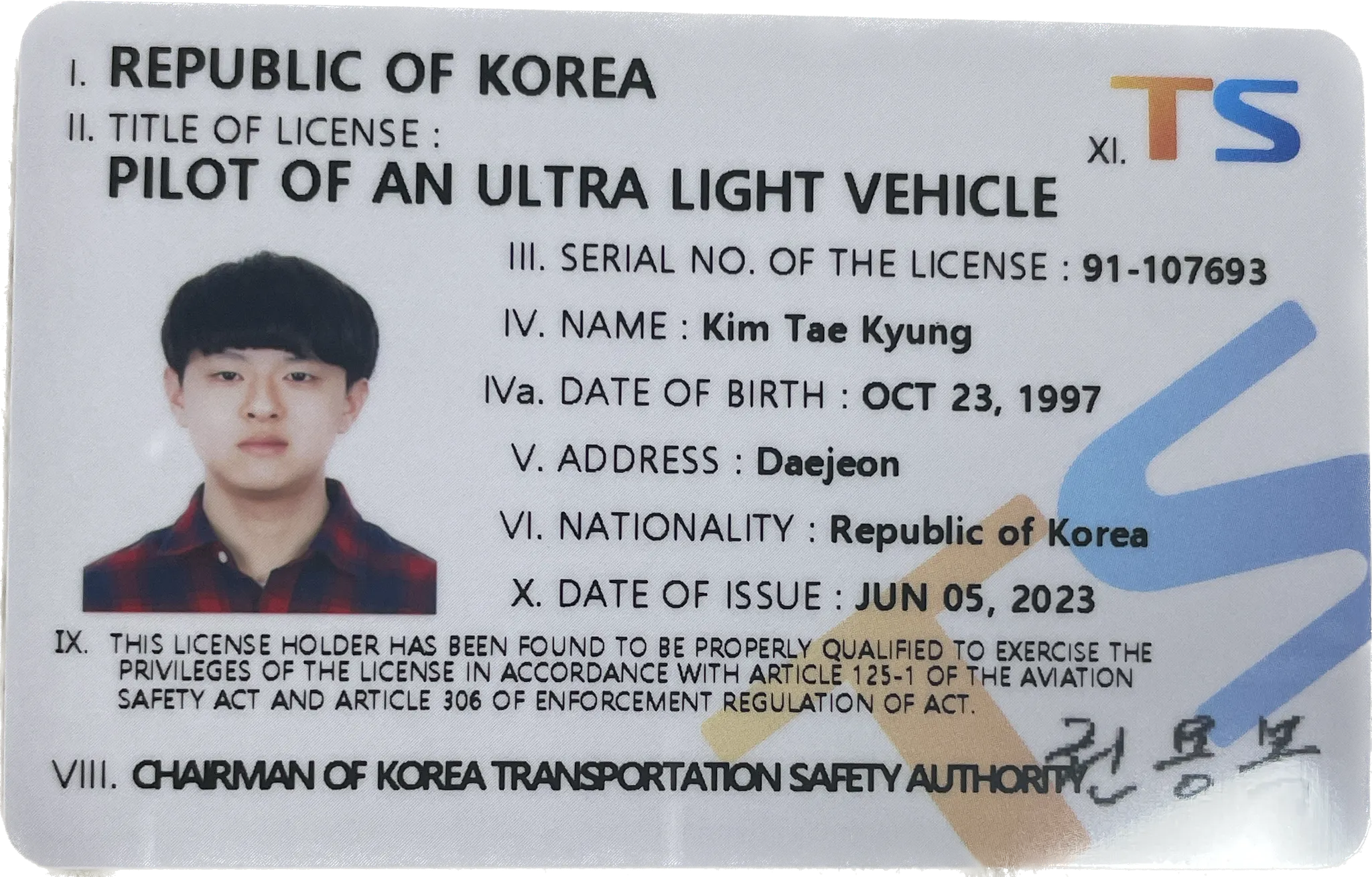 I am certified as a 'Pilot of an Ultra-Light Vehicle (Multi-Copter Type 1)' by the Korean Transportation Safety Authority. This certification allows me to operate multi-copter drones with a gross weight of up to 150 kg in Korea. The certification process included rigorous training in aviation regulations, aerodynamics, and flight operations.