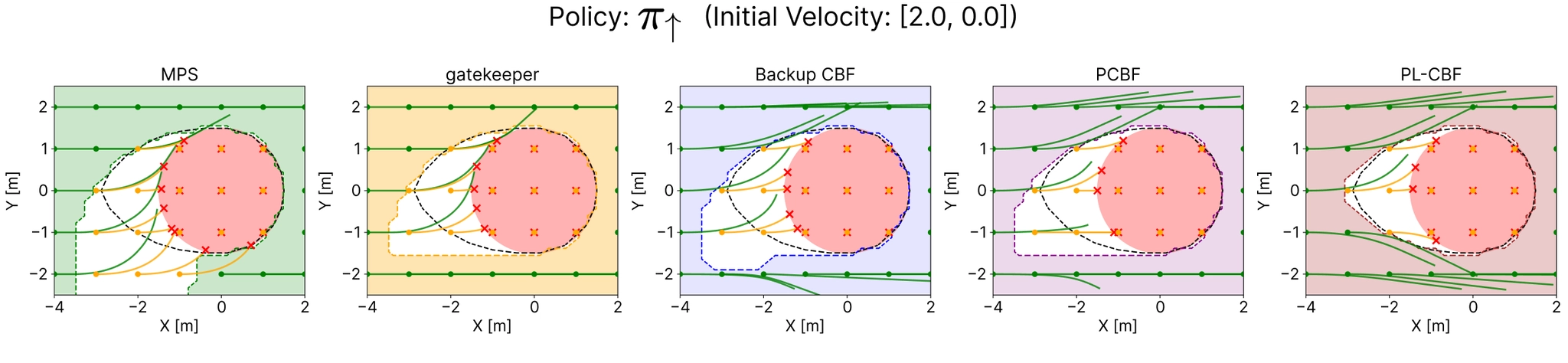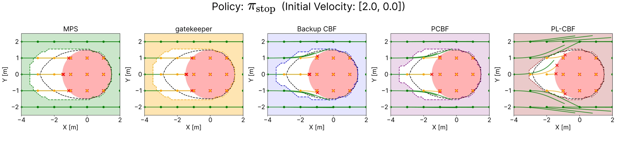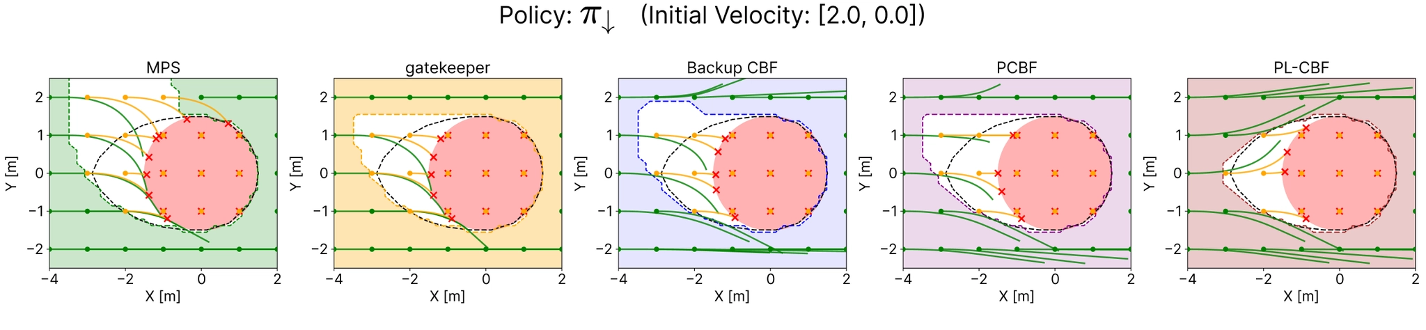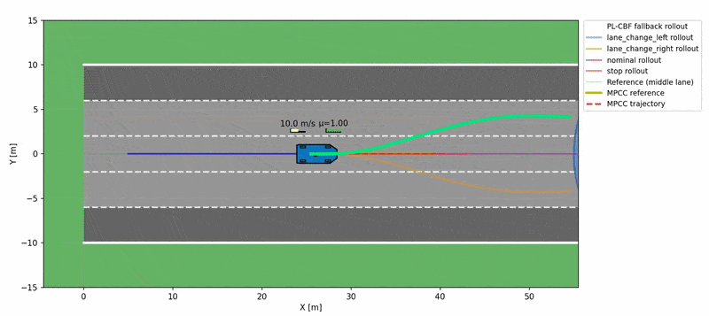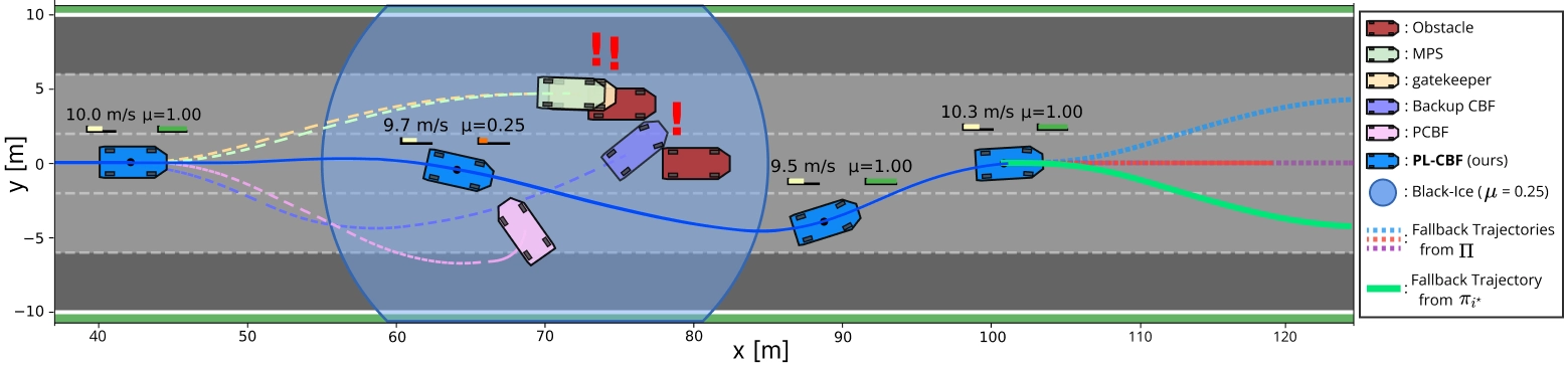 This example shows clearly that single-policy safety filters recover different safe sets depending on the chosen fallback maneuver. PL-CBF removes this tradeoff by certifying safety whenever any maneuver in the library remains feasible over the horizon.