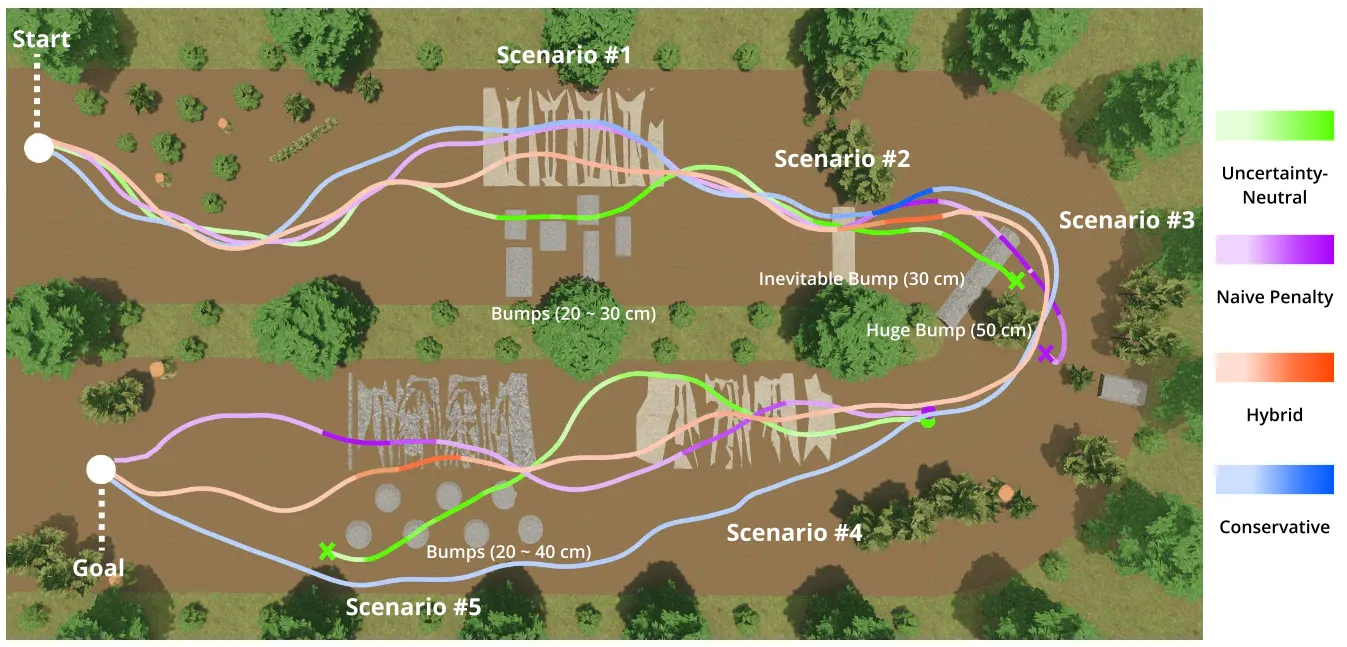 We successfully transferred our algorithm to the real-world settings for uncertainty-aware deployment tasks. These are our initial real-world experiments using zero-shot transfer, without considering sim-to-real techniques such as domain adaptation or domain randomization. We integrated our algorithm with global path planning and online traversability map generation using a LiDAR sensor. These experiments were conducted on our off-road testbeds. See ‘Future Work’ section below for more details.