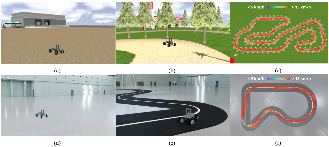 Additional experiments using a 1:5 scale wheeled robotics testbed in (a)-(c) Gazebo and (d)-(f) Nvidia Isaac Sim. (a),(d) The simulated environments during the exploration phase. (b),(e) The simulated environments during the deployment phase. (c),(f) The vehicle trajectories taken by the robot at 300 iterations for driving 10 laps in a counter-clockwise direction.