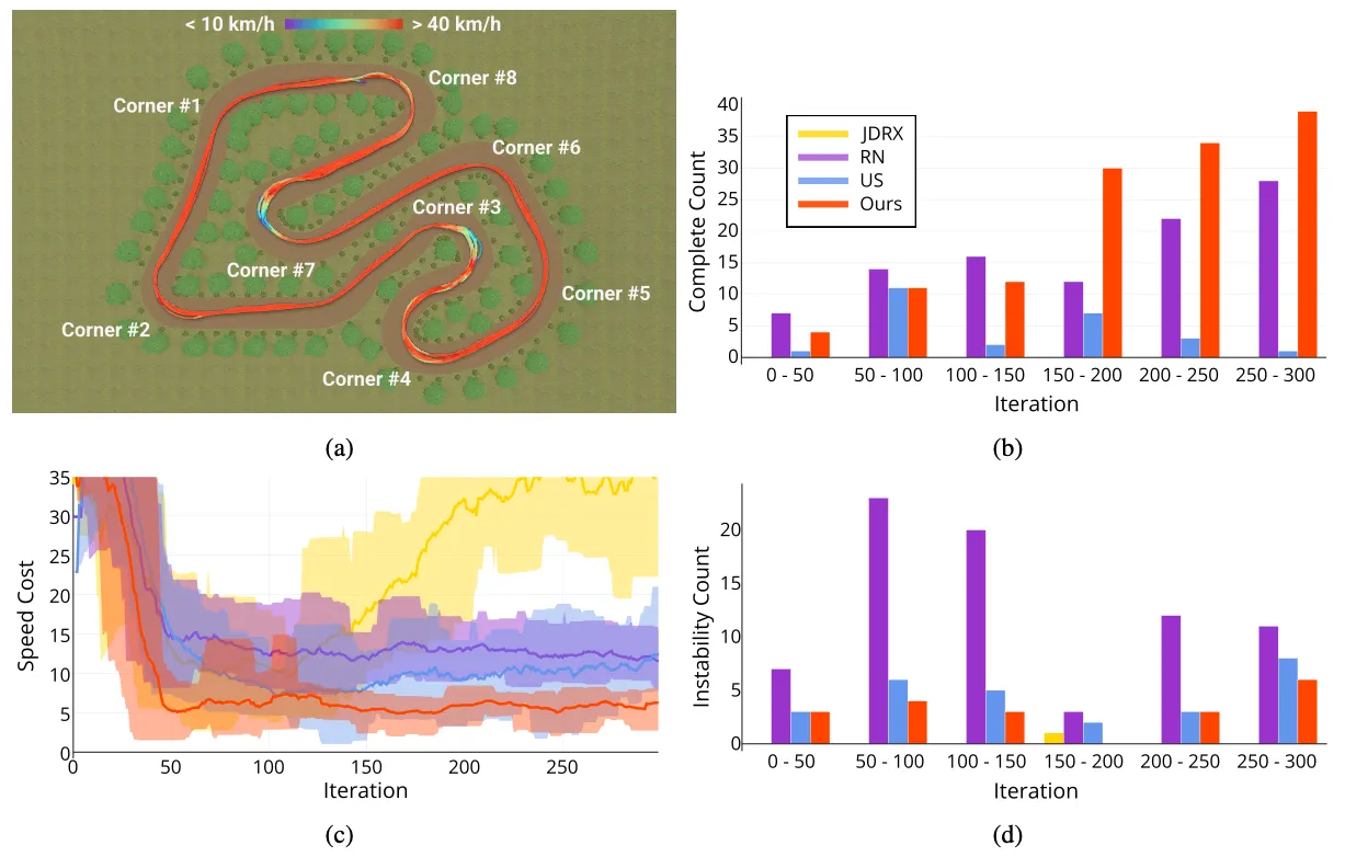 (a) The race track designed in the IPG CarMaker simulator for direct deployment experiments. We visualize the vehicle trajectory taken by our method at 300 iterations for driving 10 laps in a counter-clockwise direction. (b) The number of times that each method completes the whole lap during every 50 iterations. (c) The average speed cost for each saved model along exploration iterations. The shaded areas denote a 95% confidence interval. (d) The number of trials of each method that violates the stabilizing constraints at least once, i.e., having larger sideslip angles than 0.3 rad, during every 50 iterations.