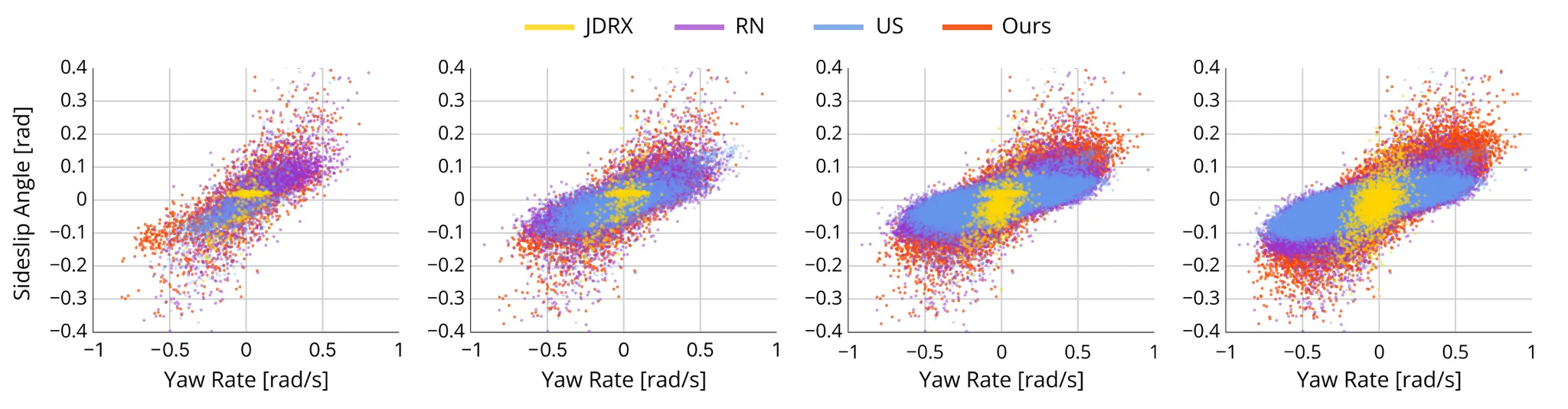 The scatter plots of collected data during active exploration. The data are from 10, 30, 100, and 300 iterations, respectively. During all iterations, ours using JRD information gain covers the largest state spaces of sideslip angle and yaw rate compared to other methods.
