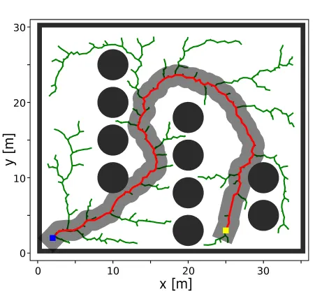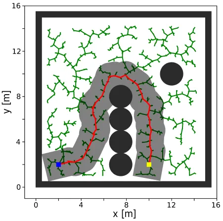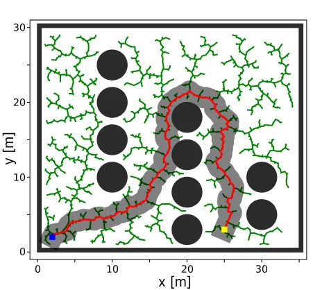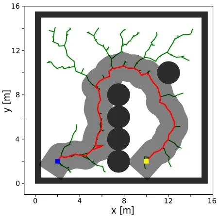 Visualization of the global planning results generated by the Visibility-Aware RRT*, without and with incorporating visibility CBF. The blue and yellow squares represent the start and goal positions. The black circles represent the known obstacles. The red line depict the final reference path. The shaded areas in gray represent the local collision-free set that the robot will sense while following the reference path.